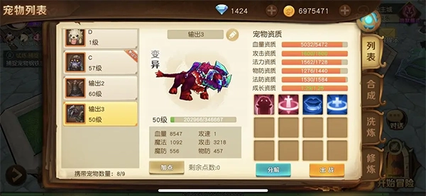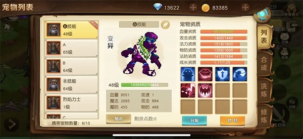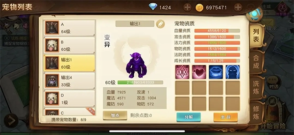 可以先用小果子清洗宠物,持续洗练直到各项资质都相对饱满,目的是尽可能提升属性,若不满意就继续洗。对品质要求较高的玩家,还可以洗出变异状态,直到各项资质都符合预期。需要准备两只这样的宠物。