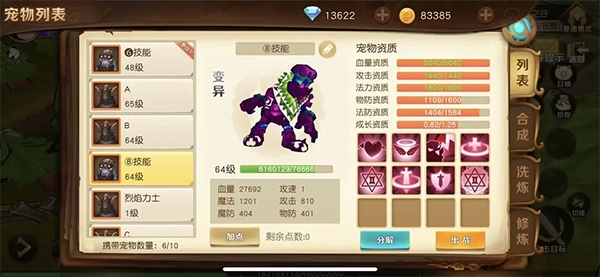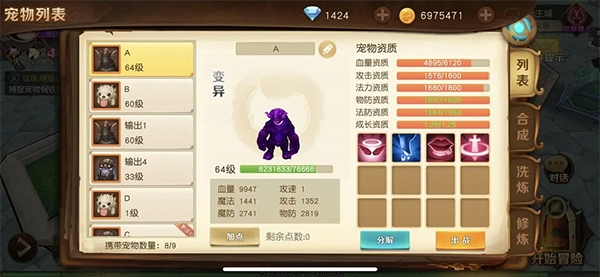 1、先随意捕捉自己喜欢的野生宠物,接着用果子洗练将其变成宝宝;要是金币充裕,就继续洗练,直到洗出变异形态,这时候换大果子接着洗,目标是得到成长值都不错的宠物。不管洗出来的宝宝初始有几个技能,最后打书完成后最多只能保留4个技能,这就是所谓的满技能了。就像图里展示的,这个资质已经可以拿来用了。