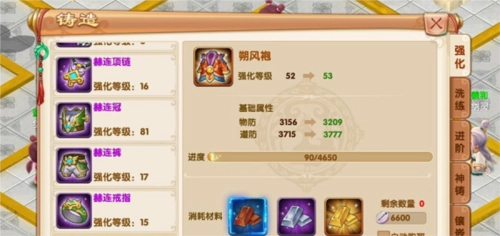 每件装备初始强化等级都是0级,最高可强化到100级,强化到满级后就不能再继续强化了。装备强化需要消耗强化材料和铜钱,消耗情况和装备的部件类型、本身等级没关系,只和当前的强化等级有关——强化材料每次固定消耗一个,铜钱的消耗量则会随着强化等级的提升而变化。强化效果仅对装备的基础属性生效,采用百分比加成的方式;另外,当强化等级达到20级和50级时,还会额外各解锁一个宝石镶嵌孔。