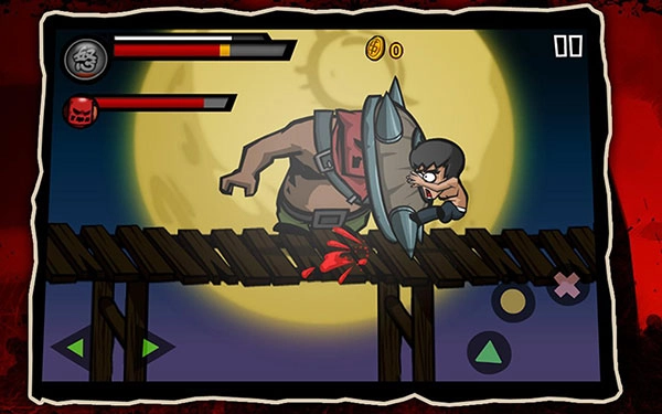 这时,游戏地图里能走的路线分成两条,我选的是“上山路”,接着再按顺序通关。第三关的游戏场景稍有变动,切换到了危险的木板桥上。和前两关比起来,游戏里的敌人数量稍微多了些。应对乱刀攻击的办法还是多运用防御键反击敌人。防御键搭配方向键可以完成跳跃,这一点在躲避步枪兵的攻击时效果更明显。