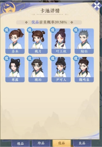 【寻访】的店员分为良品、优品、珍品、极品四种品类。不同品类的店员都可以在【寻访】中获得,其中优品和珍品店员,是掌柜前期的店员主力呢