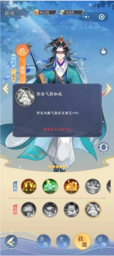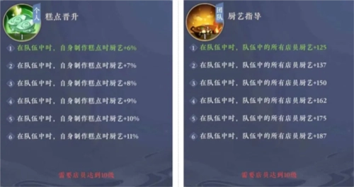 在给店员进行【升级】和【升星】操作时,能触发店员自身携带的技能加成效果。比如二星级的店员[寒露],只要上阵就能激活技能【糕点晋升】:处于队伍中时,可提高自身制作糕点过程中的厨艺值;而当她【升星】到三星阶段,还会解锁能增加全队所有店员厨艺的光环技能【厨艺指导】。这可是掌柜提升队伍整体厨艺水平的得力助手呢。