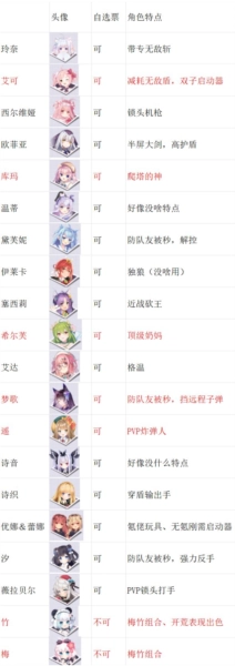 最后附上一个表,加红的是我认为难以找到下位替代的,但并不是说要你们把常驻自选票拿来换这些角色,只是说有了可以养一养而已。