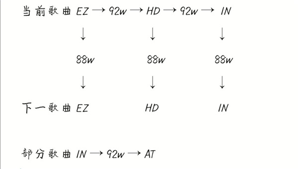 一种是当前难度分数达到92万后解锁下一难度,另一种是上一首歌的对应难度分数达到88万后解锁下一首歌的对应难度,简单来说就是像下图展示的这样。