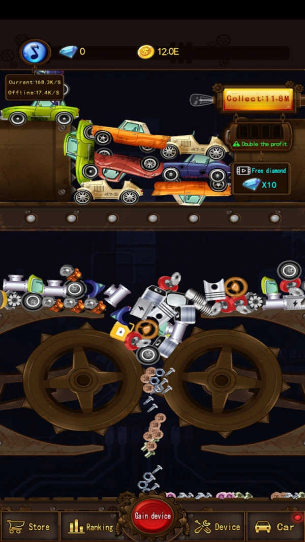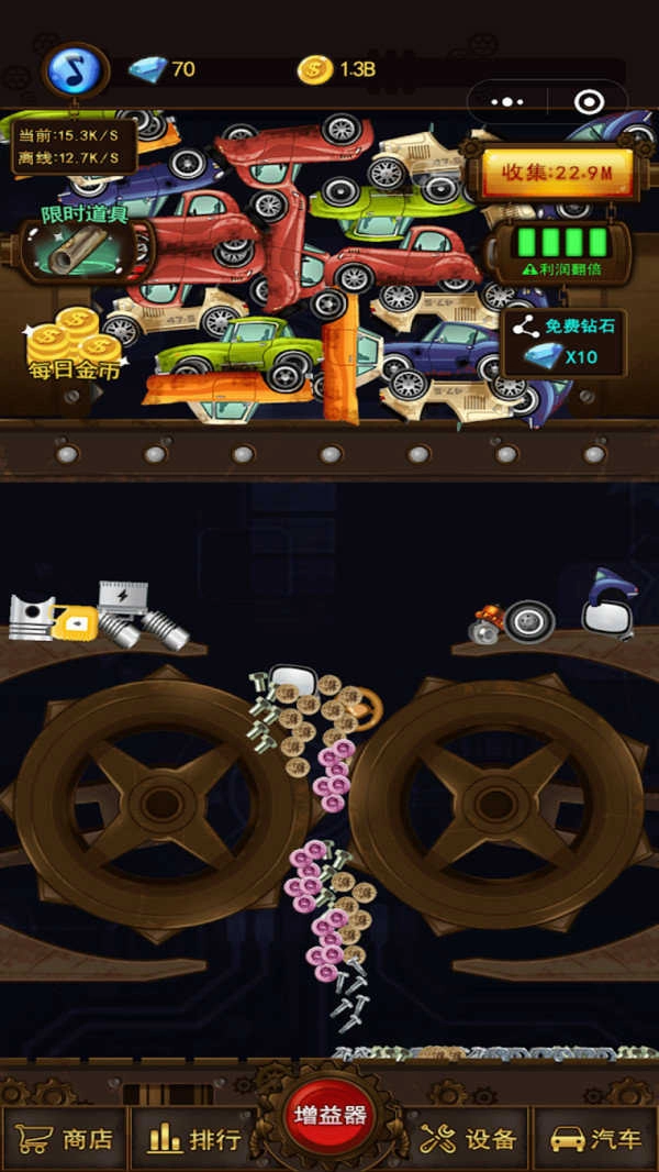 2、金币收集升级:在砸车过程中收集海量金币,用于升级机器零件、购买机油等,提升机器运行效率,以便在限时内摧毁更多车辆。
