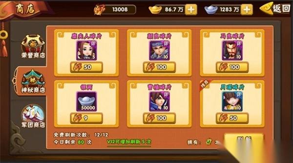 新手玩家常常会忽略一个关键细节——记得刷新神将商店!这步操作至关重要,毕竟获取强力武将的核心途径之一就是它。神将商店不仅能刷出橙色武将的碎片,还有机会直接刷到完整的橙将。建议平时多攒些将魂,一旦碰到自己主力阵营的整将,一定要果断兑换,可别等商店自动刷新后错失良机,那就亏大了!