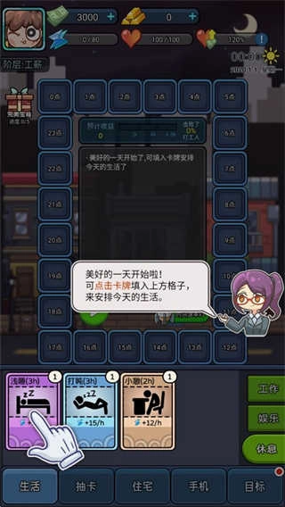 2、接下来开始为自己的生活规划一天的行程,点击卡牌填入方格内就能在指定时间进行指定活动,初始状态下休息类卡牌包含浅睡、打盹和小憩。