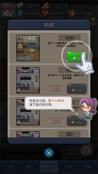 1、进入天选打工人最新版游戏后,第一步是找个落脚的地方,点击“住宅”选项,就能挑选不同的租房环境完成签约。