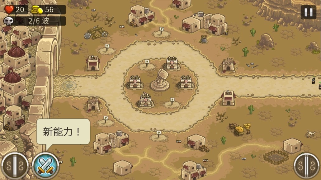 9、战斗的时候可以获得新能力,点击左下方的新能力,然后点击画面中的道路,就可以召唤两个小兵,等到冷却后,还可以接着召唤;