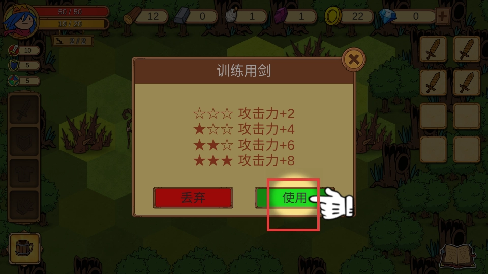 4、点击【使用】,装备训练用剑,提升攻击力,为后续战斗做好准备。