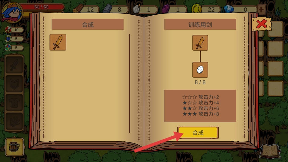 3、点击【合成】,制作训练用剑,提升角色攻击力,增强战力。