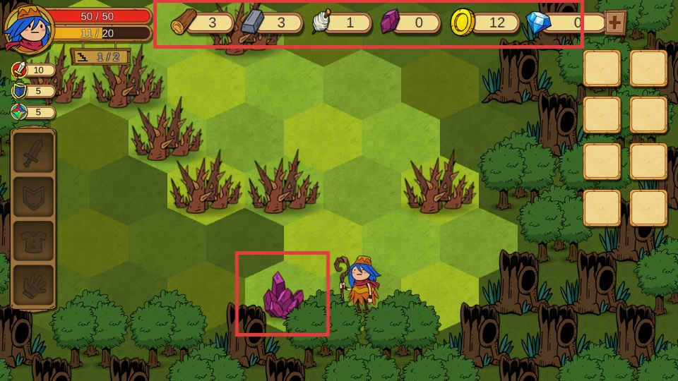 1、收集紫色水晶等资源,积累游戏发展所需材料,提升资源储备。