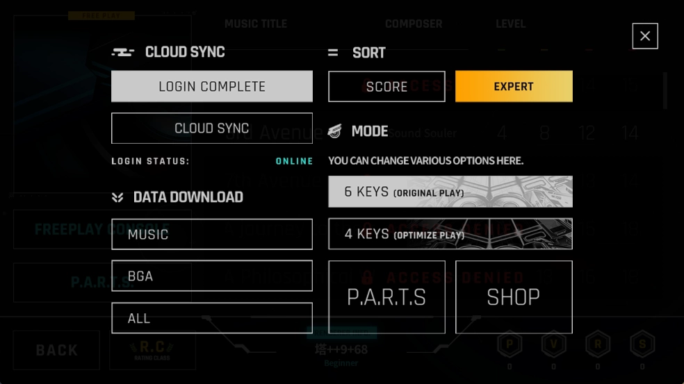 3、玩家点击界面左侧的FREEPLAY CONSOLE后,能够完成登录账户、查看游戏数据、调整歌曲难度、选择按键数量等操作,还可以进入商店进行相关操作。