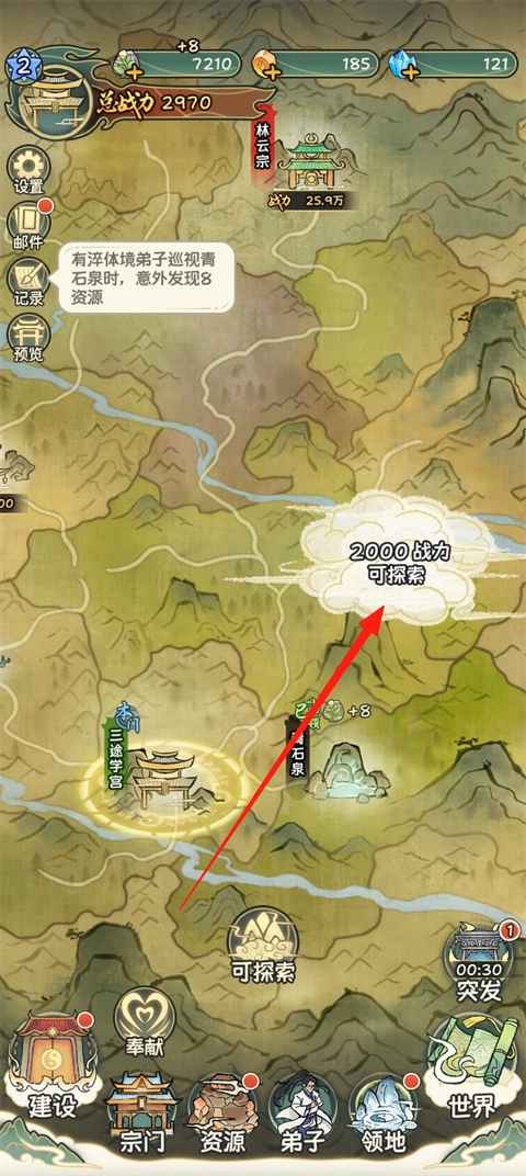 1、玩家进入游戏后,招募弟子逐步占领这个世界,达到战力即可攻占。