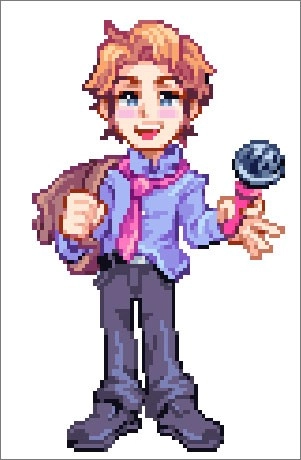 Senpai是一位电子游戏中的角色。他是个浅肤色的男高中生,脸庞始终带着红晕,留着偏分的草莓金色头发。上身穿着一件部分衣角卷起的蓝色纽扣衬衫,搭配一条宽松的粉色领带;下身是灰色牛仔裤,系着一条带银色扣头的黑色腰带,脚上穿着灰色鞋子。他的右肩背着一个棕色背包,左手则用拇指和食指随意地捏着一个粉红色麦克风。只要他不唱歌的时候,脑袋就会发出闪闪的光芒。