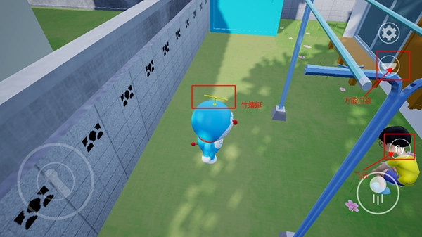 4、按照图示操作,点击哆啦A梦的万能口袋后,我成功装备上了竹蜻蜓,此时右下角弹出一个标有“fly”字样的按钮,点击该按钮就能实现起飞。