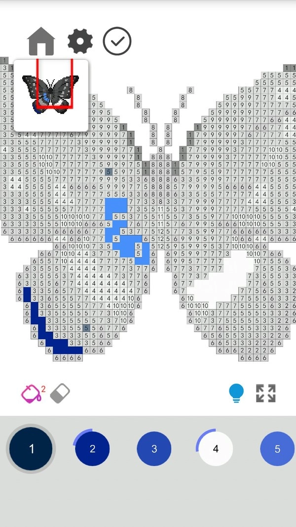 2.像素风格的图片,每一个像素都配备了对应的颜色标识与数字提示,此外还设有颜料桶之类可一键为多个区域涂色的功能。
