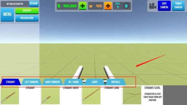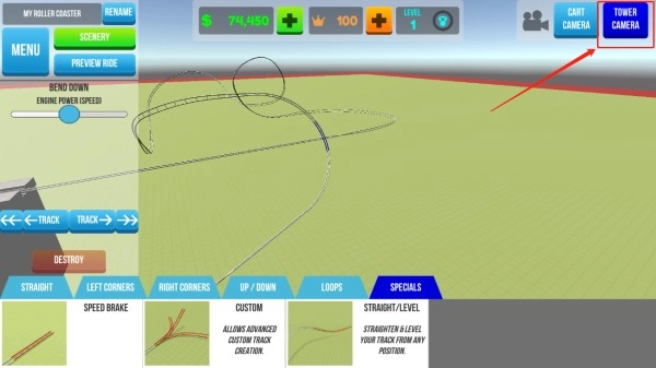 7、点击右上角图示位置,可切换搭建视角,方便进行过山车的搭建工作。