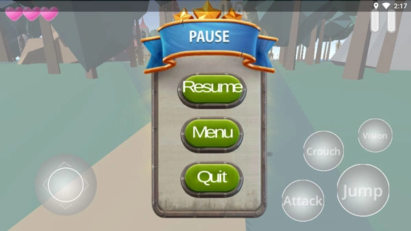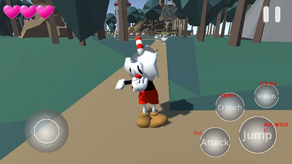 2、屏幕左下方是移动控制键,右侧则配备了Crouch(下蹲)、Vision(视角切换)、Attack(攻击)和Jump(跳跃)等操作按钮。