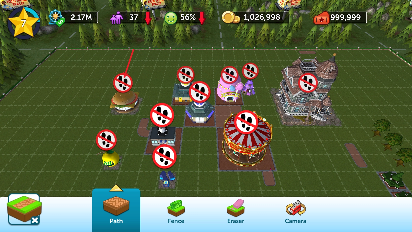 进入游戏后,我们能够自主搭建游乐设施,一旦看到图中这种禁止通行的标识,就意味着需要我们铺设道路了。