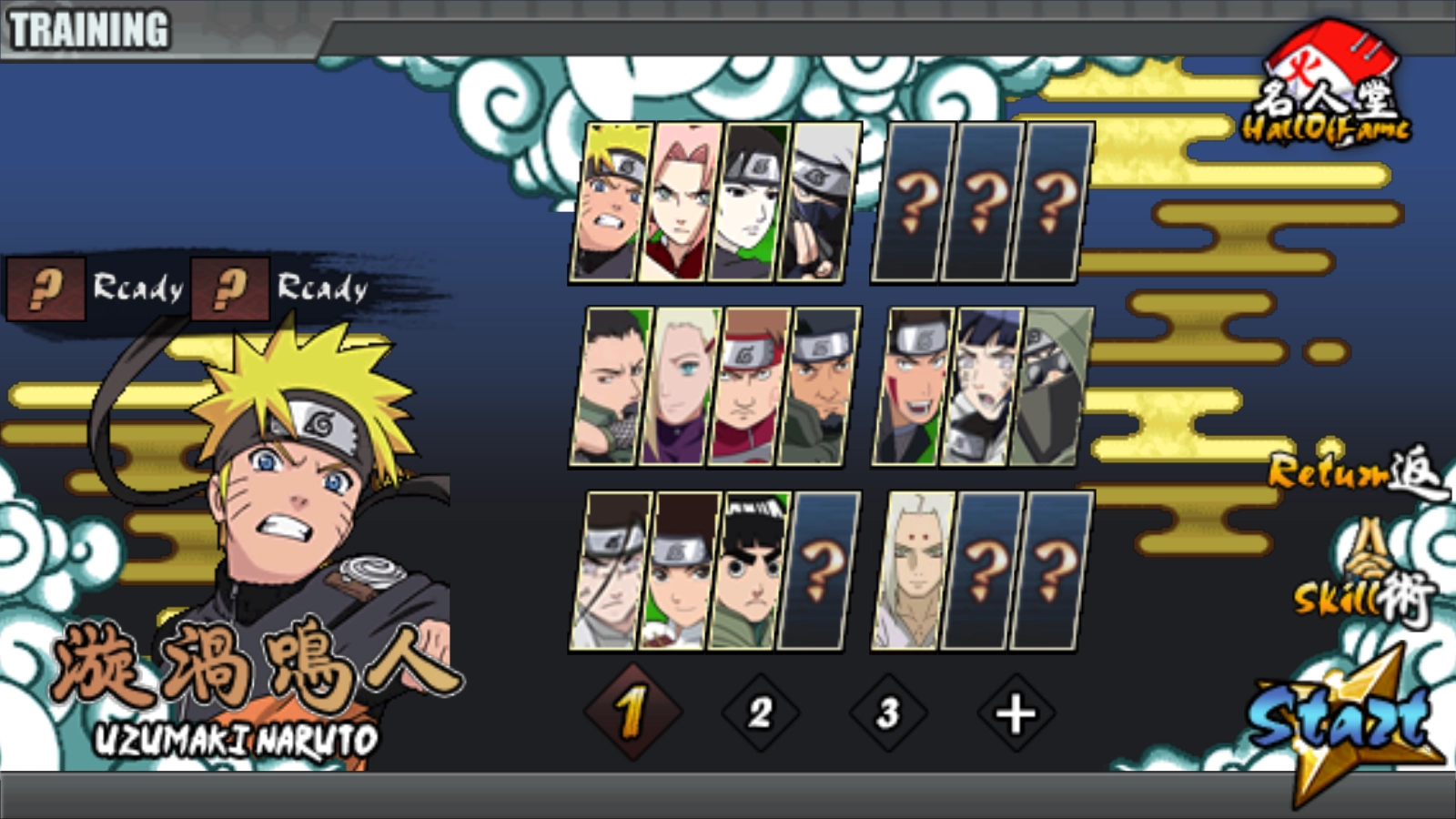 1、游戏里有不少角色,选一个就行,像鸣人这种,接着去点右边的“Skill术”功能。