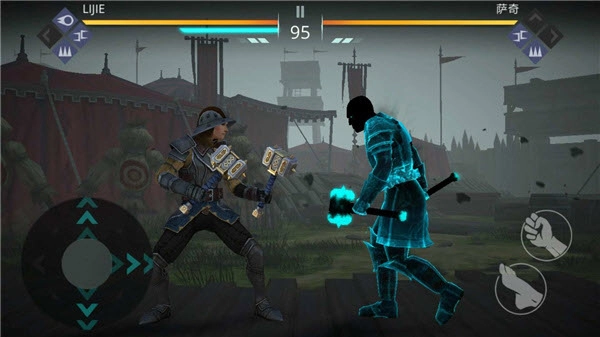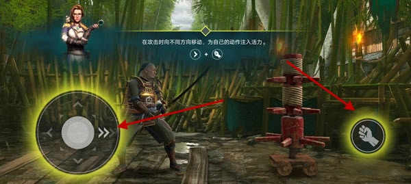 2、通过移动左侧虚拟摇杆与攻击键相配合,打出不同招式。