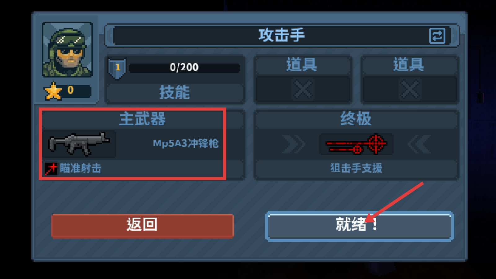 2、选择【攻击手】角色,配备主武器【Mp5A3冲锋枪】,点击【就绪!】按钮,准备开展任务执行工作。