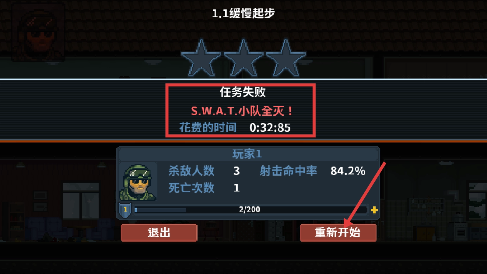 4、任务失败后点击【重新开始】,总结战斗经验,再次挑战【1.1缓慢起步】关卡。