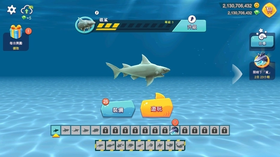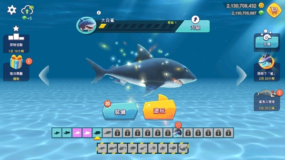 完成50个任务,寻找宝物取得金币与宝石,用来升级你的鲨鱼或者购买特殊救生道具。