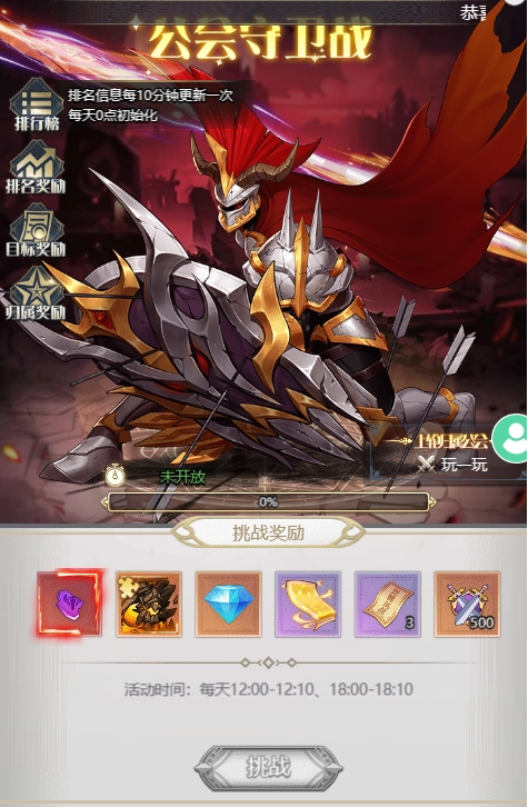 活动每天开展两场,分别在12:00-12:10和18:00-18:10。参与可获得挑战奖励、排名奖励、目标奖励与归属奖励这四类奖励,具体奖励图示见下方(温馨提示:需先加入公会才能参与哦)