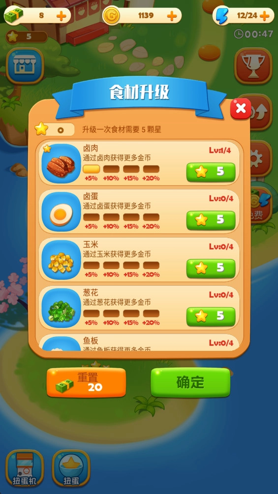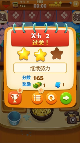 3、获取可观的收益,添置更多道具来升级你的厨房,进而挑战更多关卡。