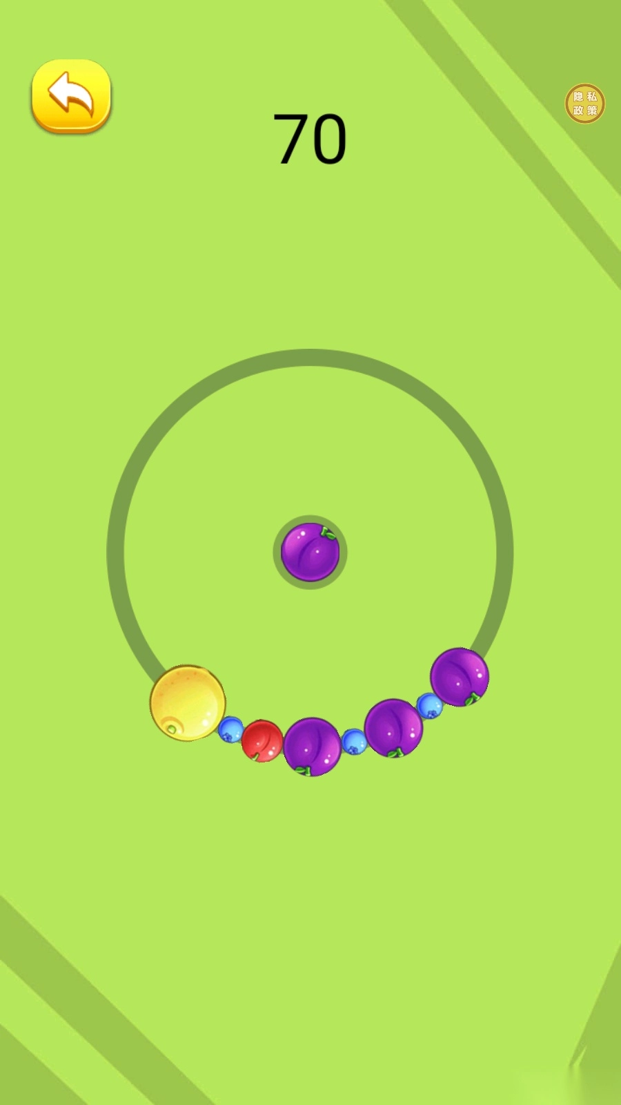 6、“祖玛大西瓜”的玩法界面如图所示,游戏中会持续添加各类水果,相同类型的水果能够合成更大的水果。