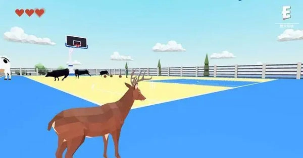 可能有人会疑惑:奶牛要去哪里找呢?别着急,整个地图里总共只有三只奶牛。复活的时候,如果看到远处体型最大的那头牛,我们朝着那个方向跑过去,就能看到一个篮球场,里面有两只奶牛正在玩耍,随便抓其中一只带走就可以了。