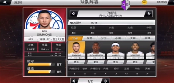 3、进入管理阵容界面后,在右侧能看到球员列表,接着点击右侧球员头像下方的更多按钮即可。