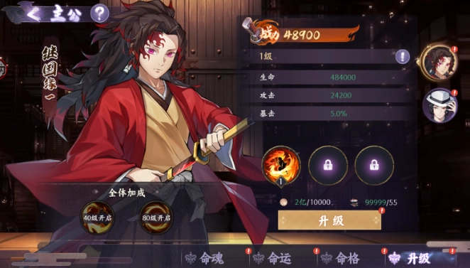 通过消耗宿命之泉和金币提升主公等级,通过完善主公命运可以提升等级上限。