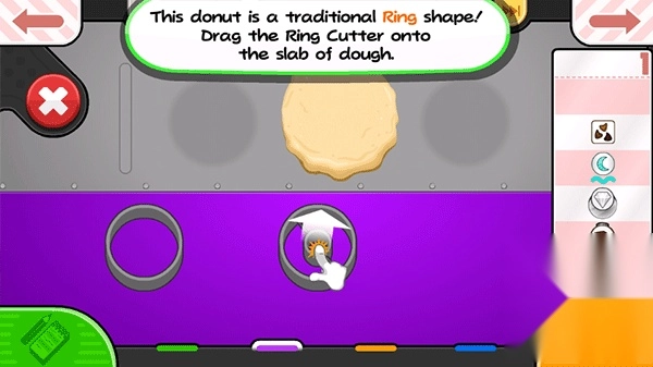 2、第一个操作区域为生面团处理站,制作甜甜圈需使用特定形状的生面团,玩家需挑选一块面团放置到工作区。接着用擀面杖将其擀成圆形面饼,再通过模具来完成造型制作。