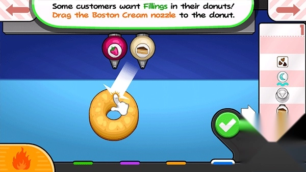 3、糖霜:每个甜甜圈都要倒入相应风味的糖霜,并放置奶油和糖霜,完整性越高得分越高。
