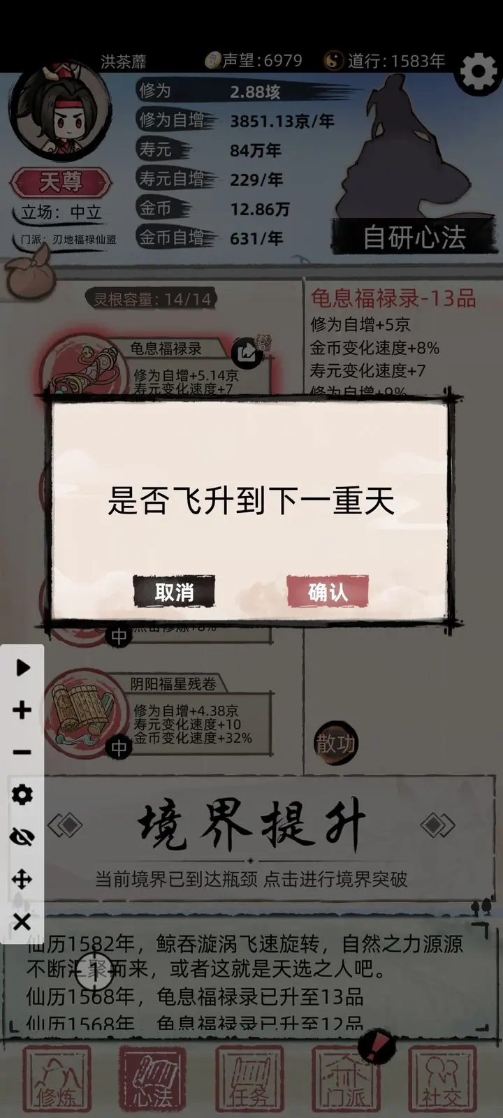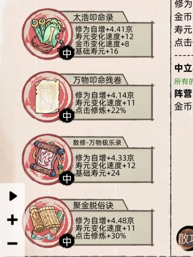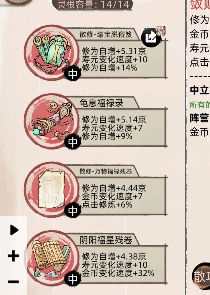 1. 第一世不用急着推进,可以慢慢体验,毕竟这一世的核心是打好基础——你得在这一世攒足后续所有轮回的启动资金。所以前期主要靠挂机积累金币就行,虽然柜台升到天级、手续费降到最低时,也能买法宝倒卖赚差价,但这个过程太耗精力,不太推荐。等后期金币加成达到四五百倍时,挂机一晚上就能轻松拿到四五百万金币了。