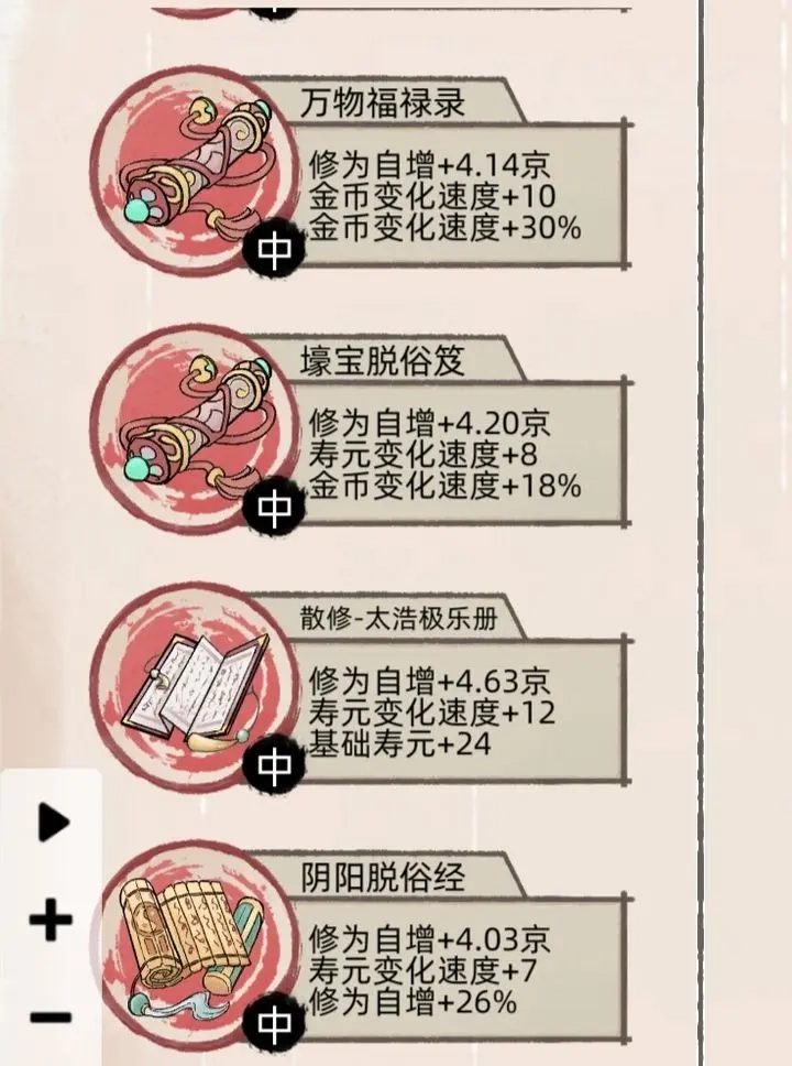 2. 钱是关键,有了钱就能灵活安排很多事,对于所有能增加修为和金币的道具,都可以果断入手。拍卖行里,山泉水、自在心、悟灵心、悟道灯、太阳裂盘、流水这些是一定要买的——流水的加成效果很显著,虽然会扣除九成寿元,但只要提升一次体质就能补回来,早点使用能更早体验到好处。另外,丹药方面,我截图里提到的那几种也建议优先购买;还有一些加修为的道具,要是收益不高,就不用特意花时间去找,碰到了再买就行。至于那些有年限限制(比如两百年的自增加成)的加成,直接不用考虑,没什么实际作用。