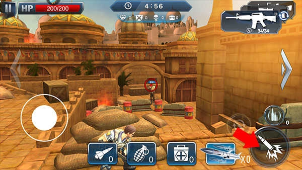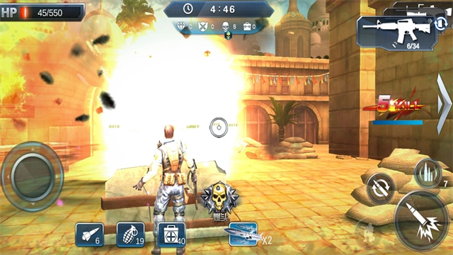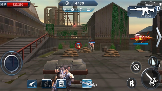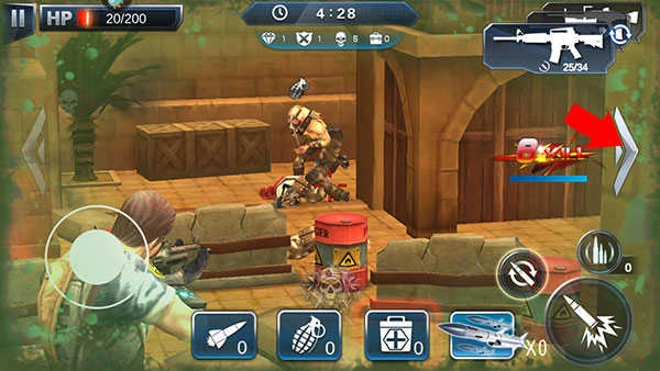 3、进入游戏后,拖动屏幕就能瞄准敌人,点击右下角的开火键,角色便会移动出障碍物并展开射击。