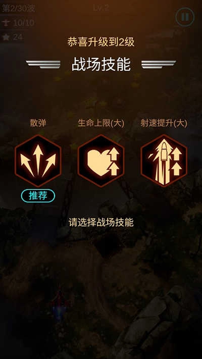 通过战斗中累积的经验值可以升级战机;每提升一级,玩家都可以在三选一的战场技能中进行选择;