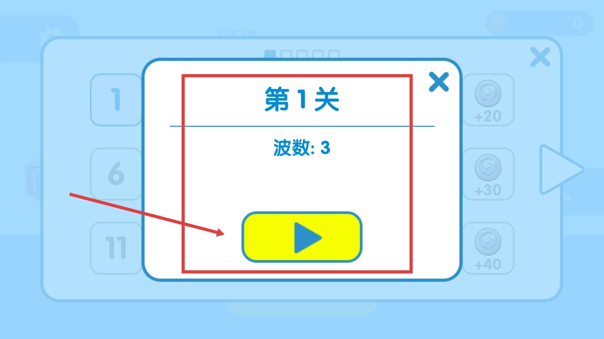 2、进入关卡选择界面后,找到并选定【第1关】中波数为【3】的关卡,接着点击黄色的开始按钮,即可进入该关卡的具体挑战环节。
