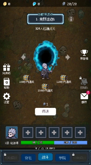 2、进入游戏后,就可以点击下方的传送开启第一关的冒险挑战了。