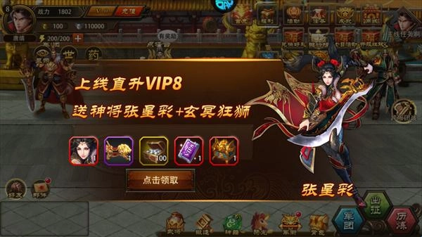 1、进入游戏后上线直升vip8送神将张星彩+玄冥狂狮