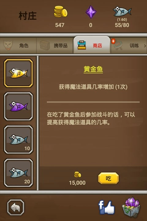 4、花费15000金币购买一次性的黄金鱼,可提高下一次获得高级装备的概率。