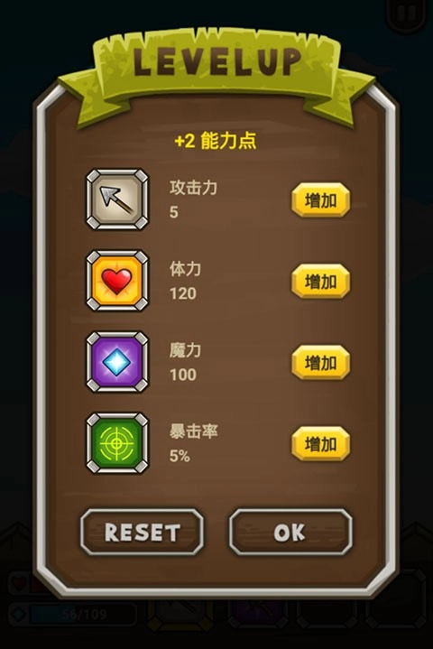 2、完成升级后,你将得到2点可自由分配的能力点数,点击右侧的增加按钮,就能提升自身对应的属性值。