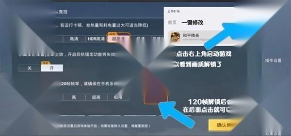 2、选择适合自己的帧率,教程图片里选择解锁所有画质和120帧率。
