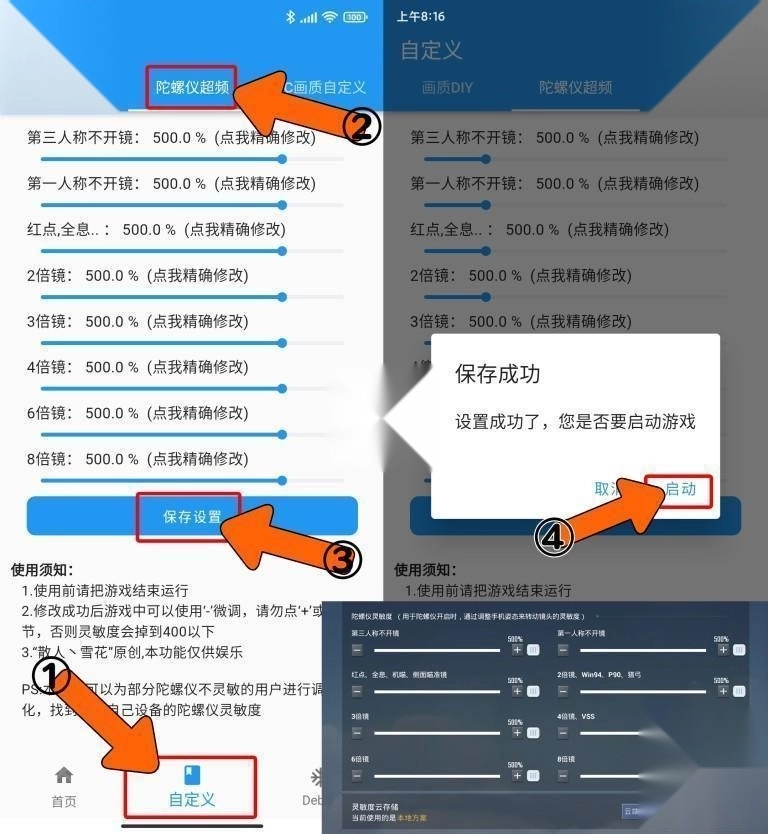 3、调整适合自己的陀螺仪灵敏度后,点击保存设置,设置成功后点击启动即可。