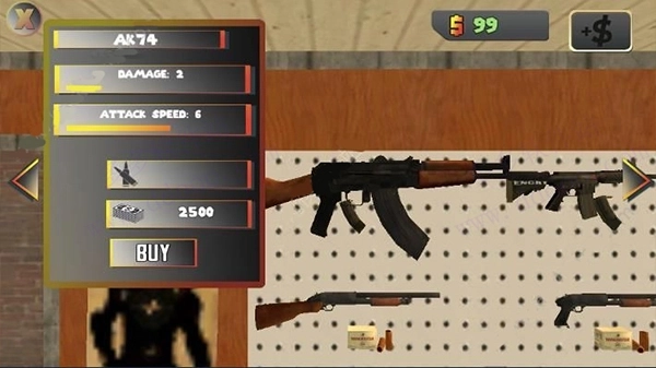 6、每种武器都标注了名称、伤害值、攻击速度、子弹类型和价格,例如AK74的售价为2500美金。