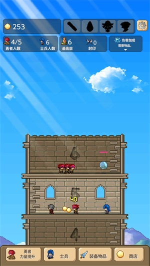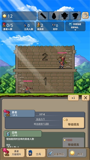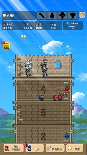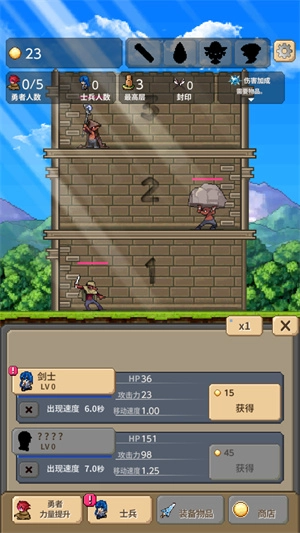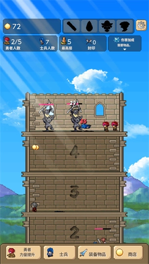 勇者之塔,原名Tower of Hero,是一款支持自动战斗的放置类闯塔游戏。玩家可召唤强力勇者进入塔楼,遭遇怪物时将自动触发战斗,过程中能借助武器快速攻击,击败怪物即可通关。此外,还需及时升级武器与装备,以持续提升自身实力。